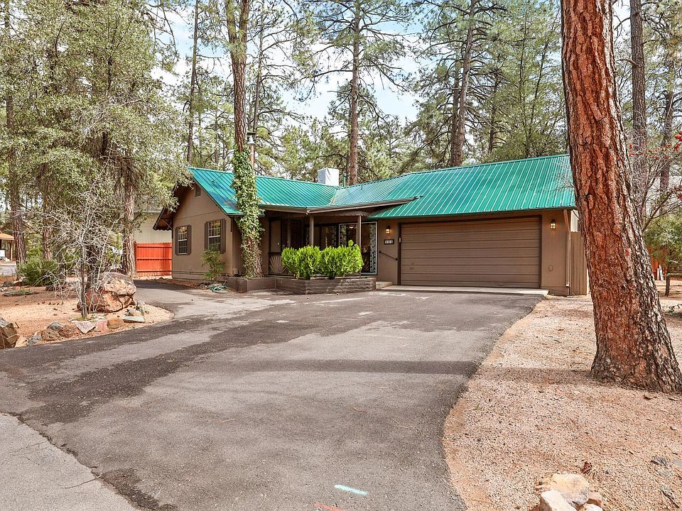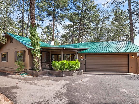 Super cute and charming starter home or investment property. Great curb appeal with circular driveway, RV Parking on the north side of the property, two car garage and Metal Roof. Interior features include two bedrooms with two bathrooms, Open great room with eat in dining room area and kitchen. Hobby room or office is located between kitchen and garage with ingress/egress to backyard. Large garage with laundry hookups. Exterior features include tall pines with natural landscape, covered patio/deck and spacious fenced backyard. Come check out this home, bring your vision and make it yours. The Fireplace in the great room not functional, but Buyer could possibly install pellet stove. Walking distance to local business and shopping. Easy to show. Sellers are active AZ Real Estate Agents. Sellers purchased green belt to the rear & south of property which was surveyed.