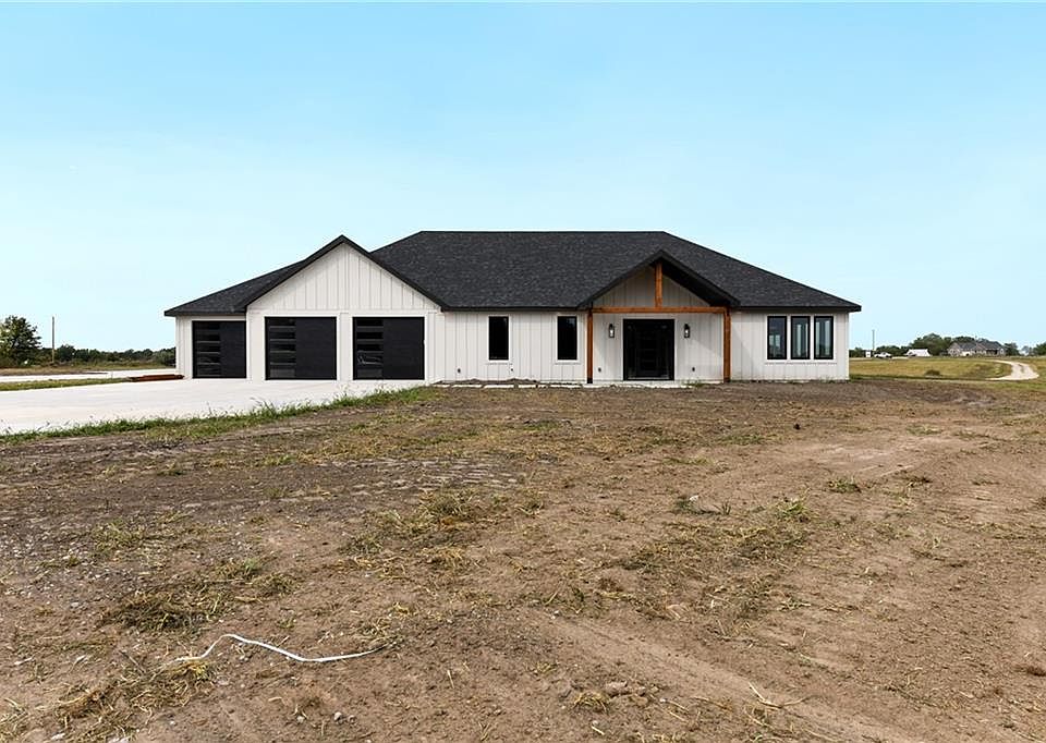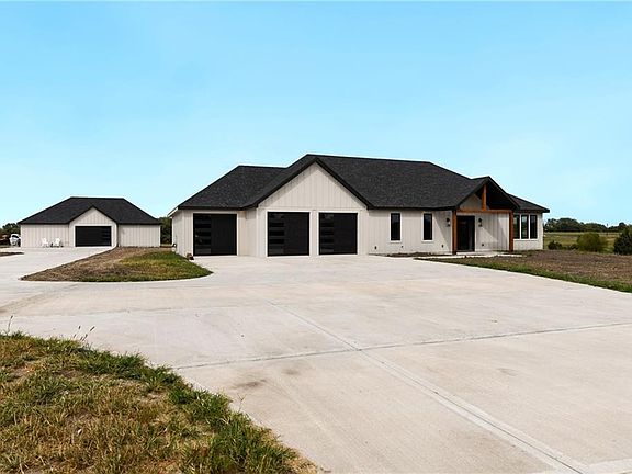New Construction!!!!  MOVE IN READY!!!! 5+ acres Come enjoy the peaceful country life but still under 20 minutes to Lees Summit! This 3 bedroom, 2.5 bath has many upgrades with office and media room.  Quartz counter tops, custom painted kitchen cabinets  upgraded light fixtures, upgraded tile in the master bath, master has huge walk in closet. Storm shelter full concrete room!!  Huge garage with heating and cooling.  Shop garage is finished with heating and cooling as well with living quarters has one bedroom, bathroom with kitchen.  Perfect for in-law sweet or rent.  Yard was just graded and will be seeded. Listing agent is owner agent and related to seller