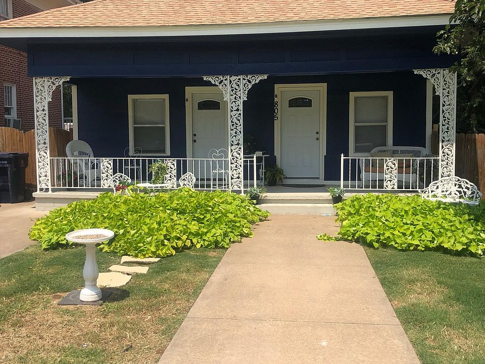 This property is unique .....It is a 3 bedroom, 1 bath home with 2 living areas, a dining area and a separate utility room. This is a separate home behind 805 NW 20th A and B All appliances included. I I inject my professional interior design background into every propety I remodel. This property has a custom bar with a wood bar top and the base is finished with gray stained rock. The home will has gray wood plank floors with dark stained wood in the living areas. There is a vintage mock fireplace with in the first living area. The home has 3 spacious bedrooms. Each bedroom has a large lighted closet with several rods and shelves and a 52 inch ceiling fans. The living areas have led can lights. The central heat and cooling system was recently installed and the plumbing is also new. The bathroom has gutted and redone with a 60 inch shower tiled in Carrera marble and dark turquoise accents. There is a separate utility room with pantry storage and a full size washer and dryer. This area also has dark stained wood. The kitchen has updated finishes and all appliances including a built in microwave and dishwasher. Not shown in pictures is a large wood front porch that has been added. I am a retired university professor and love managing my real estate portfolio as my "retirement" interest I will gladly give you my tenant contact list to verify my property management quality. I am a perfectionist and consider my tenants friends. I have checked cats and small pets ok. THIS DECISION WILL BE ON A CASE TO CASE BASIS. I love renting to young people. Mesta Park is currently the hottest neighborhood in downtown with walkabaility to uptown and is just a short distance form midtown, OU Health Science Centers, the Capitol and the Plaza District. Tenant Pays All Utilities. Small Dogs and cats accepted on a case by case basis . Parking for 4 cars off street