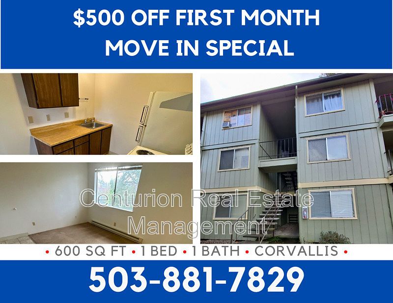 MUST READ MUST READ 1. Move-in Special ONLY applies to the current month. 2. The application process normally takes 1-3 business days. 3. Must see the property physically before the deposit is made. 4. If you have a pet, ESA or you don't have a pet you must register at https crem.petscreening.com 5. Apply to one property at a time. Address: 805 NW 23rd Street Apt #310 Corvallis, OR 97330-4684 Property Type: Apartment Rent: $1,095 + $75 Flat Rate Utility = $1,170/mo Deposit: $1,100 (On Approved Credit) Application Fee: $68 / per adult 18+ Tenancy: 1 Year Lease Bedrooms: 1 Bathrooms: 1 Sq. Ft: 600 Tenant Paid Utilities: Tenant pays $75 /month (flat rate) for water/sewer/garbage/electricity. Pet Policy: NO PETS Ready Date: AVAILABLE NOW! Viewing Status: CALL THE NUMBER ON AD TO SCHEDULE A VIEWING! Amenities Included: Fridge Stove/Oven Heat Type: Electric Laundry: None Parking: Off-Street Parking Landscaping: Owner Responsibility Pet Policy: Notice to all residents and applicants, everyone must complete the screening process. This is not only for pet and animal owners; it applies to residents and applicants who do not own pets. The pet policy includes caged animals and pets. Additional deposits and monthly pet rents will vary; keep in mind that it is subject to the approval of your petscreening.com profile. You will not be moved into the unit without this completed. Prices are subject to change, we do not guarantee prices, items change, and errors occur. If there is a discrepancy between a price online and a price in the office, supervising property manager shall have the final say. *Due to overwhelming demand we may not be able to respond to your rental inquiry. INTERESTED IN THIS PROPERTY? Properties are on a self-showing lockbox and each listing specifies how it is viewed. Feel free to drive by the property to check it out. This information is deemed reliable, but not guaranteed. Centurion Real Estate Management, LLC 2380 NW Kings Blvd Ste. 301, Corvallis OR 97330