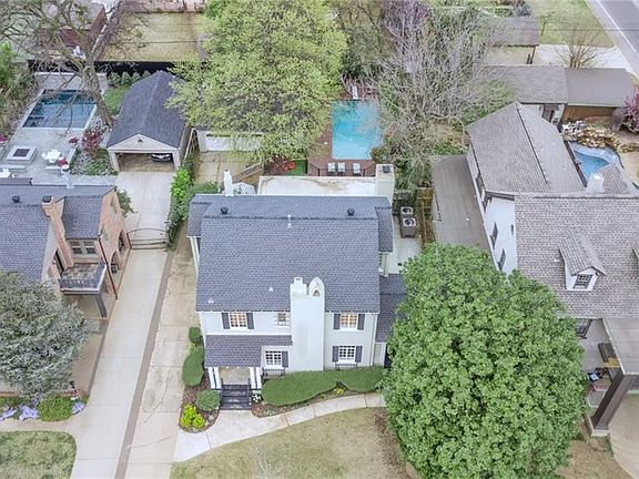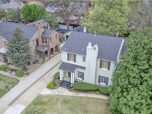 Lovely mature tree lined street encompasses this remarkable Crown Heights home. The home features functional as well as aesthetically pleasing living spaces. The cheerful living room has a fireplace and access to a covered side porch. The open formal living and dining areas leads to a wonderful family room with fireplace with wet bar overlooking the back yard. The kitchen has granite counters and stainless appliances. The back yard provides an oasis from the Oklahoma summer sun and features outdoor living spaces and refreshing pool. The guest house with bath has neutral finishes and is strategically located for pool side entertaining but can also accommodate overnight guests. Upstairs bedrooms are well appointed including size. Master bedroom has updated bath with storage and huge walk-in closet and dressing room. Walk to all your favorite neighboring parks plus shopping & restaurants on Western Ave. Fresh decor and purposeful living spaces are the key to this desirable home.