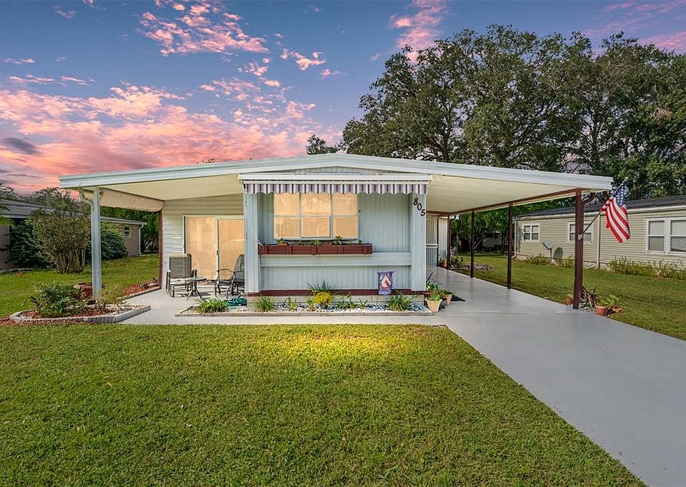 This lovely 2/1 TURNKEY home has many features that are sure to please, such as: NO BOND, NO CDD, NO CARPET, 10x 20 BONUS ROOM w/ AC, METAL ROOF, HVAC 2022, NEWER WASHER & DRYER, and HWH 2022. In addition, the living room/dining room combo area, BONUS room, and BOTH bedrooms feature laminate flooring. The kitchen has a built-in stove, NEW range hood, cooktop, refrigerator, LAMINATE countertops, freshly painted cabinets, space with hookups for a dishwasher, SKYLIGHT, and a LARGE bay window that features a retractable awning. Both bedrooms have built-ins and LAMINATE floors. The Bathroom has a walk-in shower and double sinks and has been updated with new tile, a toilet, and a painted vanity. The large carport has ample space for a car, a golf cart, and extra storage. This home is a convenient location that allows for quick golf cart rides to Spanish Springs Town Square, Orange Blossom Hills Golf Country Club & Pool, The Villages Hospital/Medical Facilities, shopping centers, restaurants, and more. Don't miss out on your chance to own an affordable home here in The Villages, allowing you a lifetime to enjoy The Villages Lifestyle in a desirable location with great amenities.