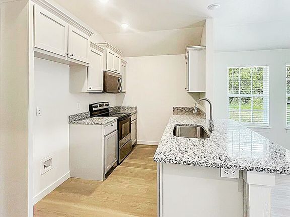 This home features bright, airy rooms with vaulted ceilings and large windows that fill the space with natural light. The kitchen is both stylish and practical, with granite countertops, stainless steel appliances, and a generous island perfect for meal prep or casual dining.