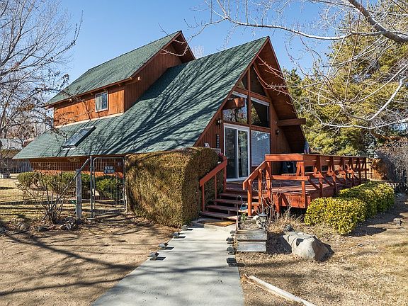 Quiet & peaceful West Bishop location for this 2 bedroom, 2 bath home on half acre. Open living area with big East facing windows & vaulted beamed ceiling. Roomy loft provides plenty of room for an office, library or exercise space. Open deck off the front of the house with additional covered deck & open patio in the backyard. Detached two car garage, garden area with green house. This home sits amongst peaceful streams, shaded by numerous mature trees including fruit trees. The open and bright interior floor plan is heightened with beamed ceilings, track lighting and warmed by a brick fireplace. The downstairs houses a sunny kitchen, a bedroom and a bath plus laundry room. Come see!