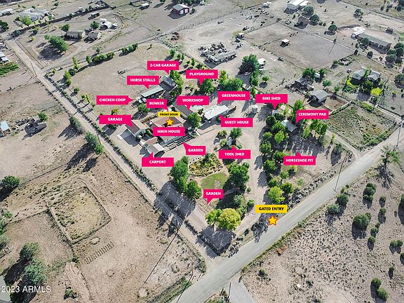Discover your Self-Sustaining Oasis in Paulden, AZ. Nestled ~30 minutes from Prescott, this Paulden ranch is a prepper's dream. Sitting on 5 fenced acres, it boasts a high-producing well with windmill-powered 10,000-gal storage tank plus an extra well, also high capacity. Security is ensured with an automatic gate, mature trees and a secluded location. The main house offers 4 bedrooms, 3 baths, a beautiful kitchen, huge living room, true soundproofed media room, laundry room, dining room, pantry, and more. Compound includes 1248 sqf workshop/garage (w/office+ bathroom), 480 sqf bunkhouse, 768 sqf garage, a bunker/root cellar/wine cellar, another 2-car garage/storage container, horse facilities, gardens, ponds, etc. This gem is a haven for those seeking self-sufficiency in a crazy world.