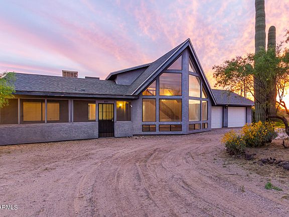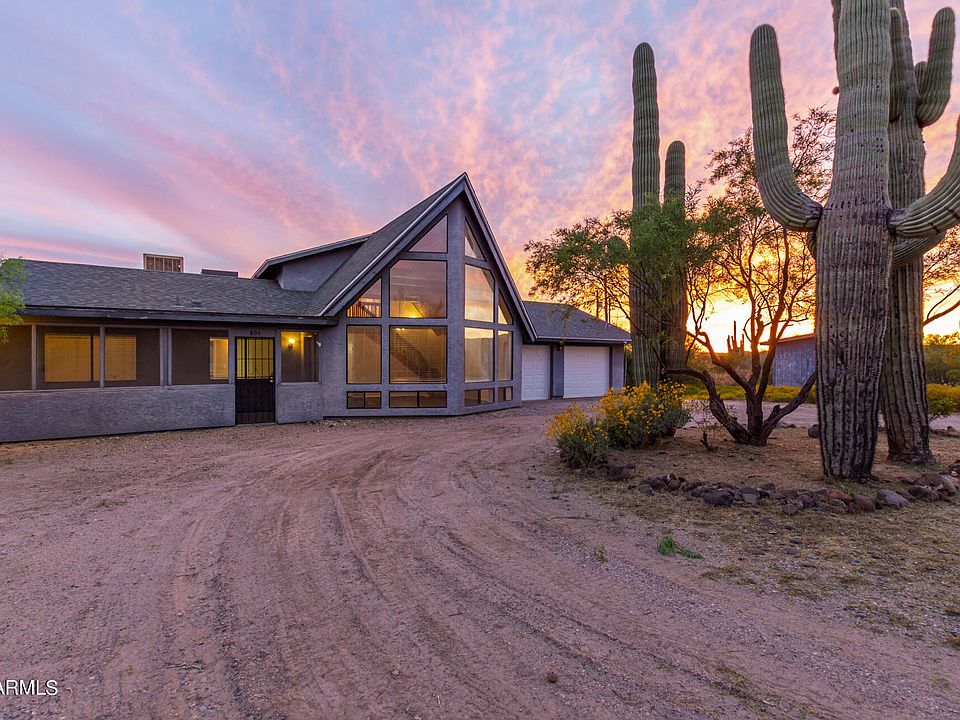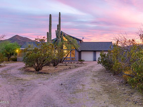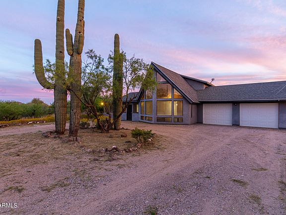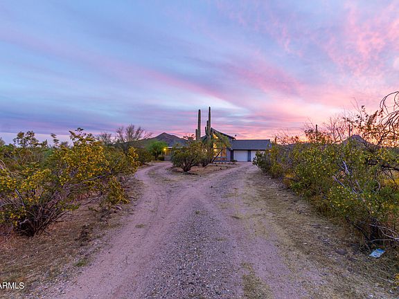 Welcome to your Dream Sanctuary, nestled on a sprawling 2 Pristine Acre lots surrounded by a lush natural landscape, where serenity & privacy are guaranteed w/no immediate neighbors. This property is in a neighborhood that borders public land for recreational opportunities and a dead-end for privacy. 45 min to Sky Harbor Airport and 15 Min to Anthem. Beautiful View of Daisy Mountain and Gavilan Peak with lots of Hiking Trails. Enjoy your favorite morning beverage in the sun-soaked front sunroom! Exquisite interior boasts 3 beds, 2 baths, a loft-style primary suite, & a spacious living room tongue groove wood-beamed vaulted ceiling. This gem perfectly blends modern design and rustic charm! Eat-in kitchen has built-in appliances, gorgeous counters, ample storage, & a center island w/breakfast bar. Upstairs, you'll find the loft-style primary suite, offering a walk-in closet & an ensuite w/a tub/shower combination. The covered back patio is the perfect spot to contemplate the stunning sunset views of the surrounding landscape. Escape to a few degrees cooler than Phoenix, This won't last long!