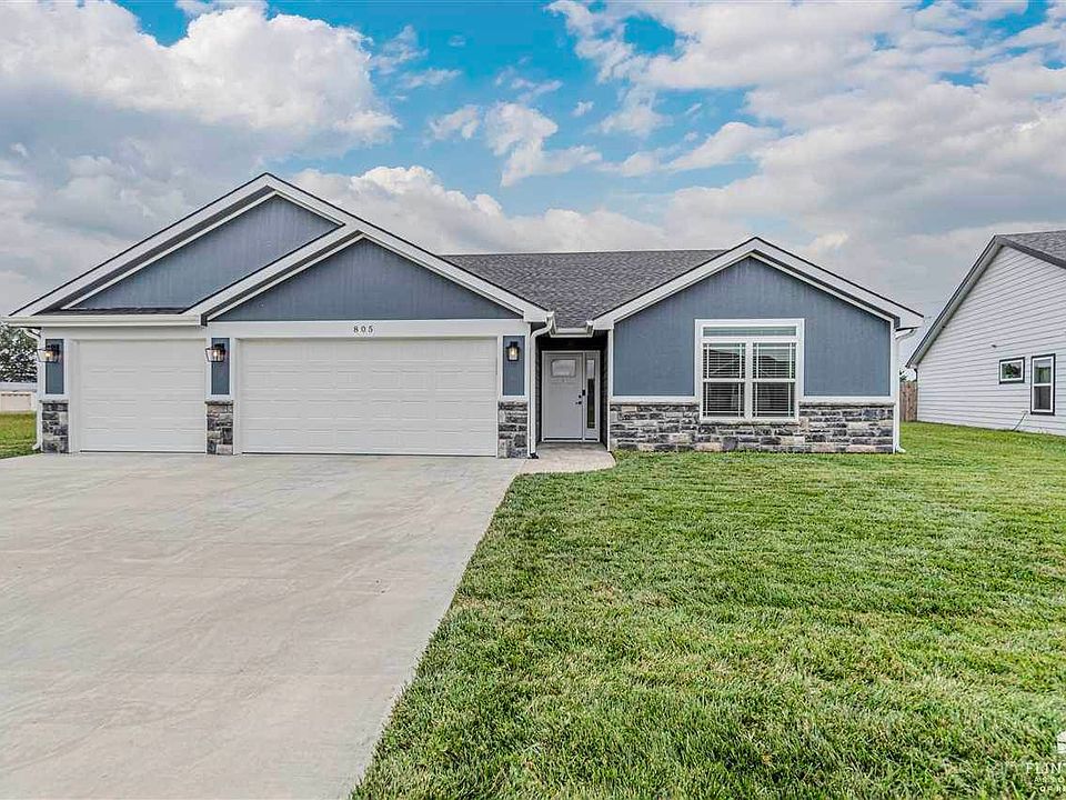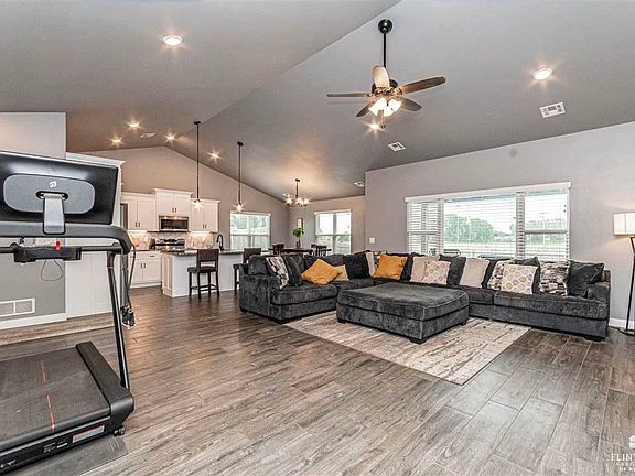 Nestled just minutes from Downtown and the vibrant Westside of Manhattan, this stunning home offers the perfect blend of luxury and convenience. Its open layout provides a graciously sized living area designed for both comfort and style. The heart of the home is a beautifully appointed kitchen, complete with a hidden walk-in pantry. The primary bedroom is a true retreat with ambient tray lighting, boasting an en suite bath. Architectural details such as vaulted and coffered ceilings throughout the home add a touch of sophistication, while the vaulted and covered back patio and backyard are fully fenced. The triple garage provides ample space for vehicles and storage, including an ICF storm shelter ensuring peace of mind during inclement weather.