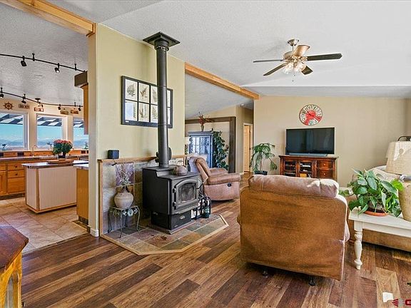 Perched above the valley with AMAZING VIEWS of the city lights at night and the glorious mountains that surround us you'll find a tranquil slice of Colorado paradise! This ranch style home is warm and inviting with large NEW windows to take in the majestic San Juan's from the living room while cozied up next to the wood-burning stove. The 3 bedroom, 2 bath split floor plan features a large master suite on one side, the living room, kitchen and dining all centered in the house with the secondary bedrooms and bath flanked on the other end. The spacious kitchen features a large corner pantry, stainless steel appliances including a gas stove and fabulous views from the kitchen sink window where you can watch the dogs and kids play in the yard or the elk herd passing through. All bedrooms have walk-in closets and all flooring is solid surface; tile and gorgeous vinyl plank for easy maintenance. There's also a 900 square foot heated garage. Also on the property is a 9-hole homemade mini golf-course and a horseshoe pit for getting outside to recreate and enjoy this peaceful setting. Create your sustainable lifestyle on this off-grid property, serviced by a well and includes a 600 gallon cistern for water storage as well as a 2500 underground tank for emergencies. If off grid isn't your style, the land directly across the road recently brought electricity in, making it more easily accessible should you have the same desire. This 45+ acre parcel has been partially mitigated and is located approx. 25 minutes from Montrose on paved roads for all except the last mile. If you're looking for privacy and elbow room, this may be the perfect place for you to call your happy home!