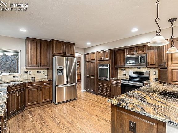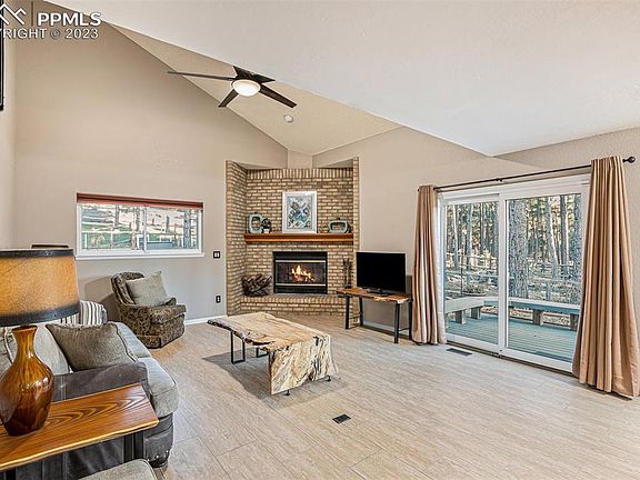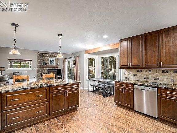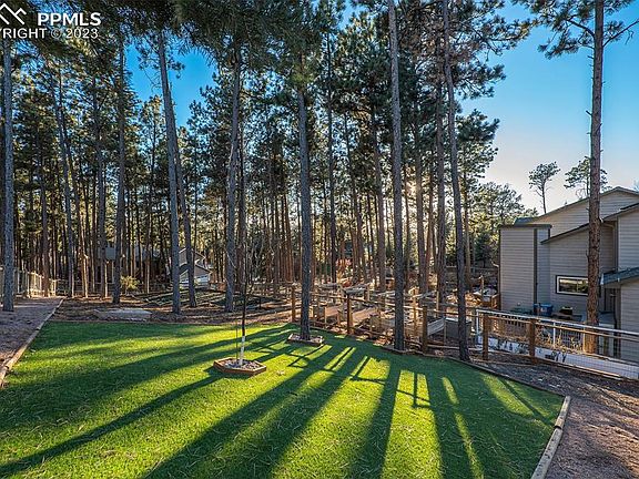 Gorgeous Woodmoor home with a main level bedroom and bath, this stunning two-story residence is surrounded by towering Ponderosa Pines on over ¾ acres of pure beauty. The pristine backyard features several decks, a serene pond and fenced areas for your four legged family members. Step inside to discover the timeless elegance of gleaming hardwood floors that flow seamlessly through the kitchen, living, and dining rooms. The family room, with a soaring ceiling is centered around a cozy wood fireplace. Walkout to a massive fenced backyard with a picturesque pond feature and a charming garden where deer gracefully wander. The updated kitchen is a chef's delight, featuring gorgeous granite slab counters and a substantial breakfast bar that opens to the family room. Retreat to the expansive master suite, offering a remodeled master bath and ample closet space. Upstairs, three generously sized bedrooms await, with one incorporating a built-in queen-sized hide-away bed for flexibility, perfect for guests or an additional office space. The loft area provides a quiet space to read and relax, overlooking the family room. The finished walkout basement adds versatility to the home, providing a lot of recreation space, a workout area, and the fifth bedroom with its own bath—an ideal retreat for teens or guests. The massive crawl space offers well-lit and heated storage for seasonal items. This home has three dedicated outdoor parking spaces plus an oversized attached 3-car garage & next to a dedicated walking trail. Enjoy the outdoors year-round in spacious outdoor living spaces to enjoy the beauty and wildlife while remaining nestled within the trees, & sheltered from the wind. The solar system with an electric car charger adds economical utilities. Rest easy knowing the home is well-maintained and protected with a 50-year shingle roof, updated mechanicals, central AC, a radon mitigation system, a sump system, fresh paint, newer flooring offering a turnkey Woodmoor home.