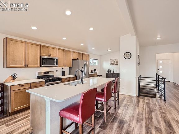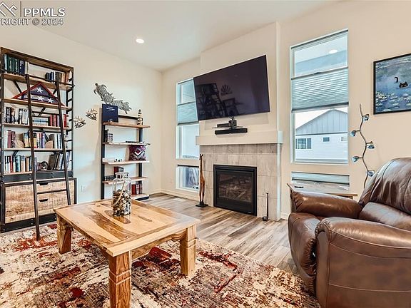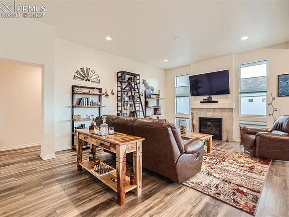 Well-maintained 4 bedrooms (with 5th bedroom option), 3 bath ranch home with a finished walkout basement, and views of Pikes Peak in Cumbre Vista! The main floor features an open floor plan centered around a spacious family room with a gas fireplace and kitchen with luxury vinyl plank flooring, a large island, and a double pantry. The split floorplan offers privacy with the primary en-suite bedroom in the back of the home and a secondary bedroom and bath in the front. Step through the sliding glass doors onto the covered deck with custom privacy shade and Pikes Peak views. The laundry/mud room is close to the 3-car garage on the main level. The finished basement boasts a custom wet bar, 2 more bedrooms, a full bathroom, a ready-to-finish 5th bedroom option, and a secondary living room, that walks out to the backyard, complete with xeriscape and a fire feature! The roof is a GAF-class shingle with a transferrable warranty. Near the Powers corridor shopping, dining, entertainment, hospital, parks, and trails.