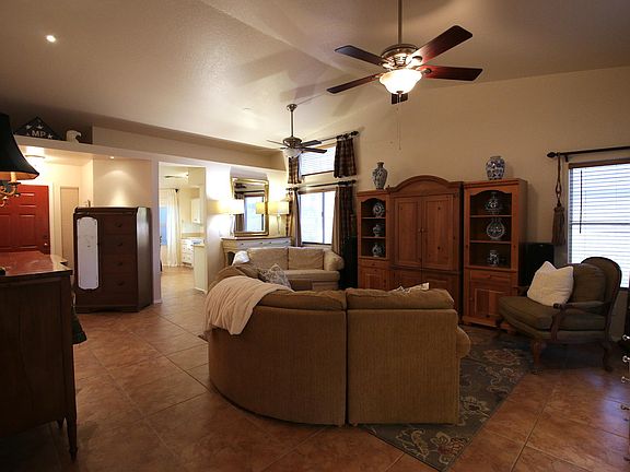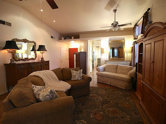 Your new home awaits! Single story located in private Eastside community. 2-bedroom, 2-bath plus den. Den has many options for use, 3rd bedroom, dining room, gym, office. Neighbors behind the home are Mesquite Valley Growers, so very quiet. Vaulted ceilings, plant ledges and a beautiful master bath. Large, private back yard boasts mountain view, full covered patio, lush foliage, faux flagstone on the wrap around patio. Water softener and built in garage cabinets. Convenient to shopping, schools, restaurants, bus. Master bedroom curtains do not convey.