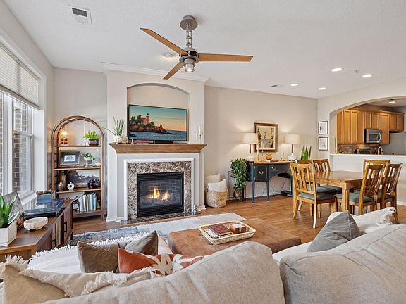 Desirable row-style townhome in a super convenient location walkable to Downtown Golden Valley shops and restaurants, Brookview Golf Course, multiple parks and blocks to the Luce Line Trail System! Rarely available tucked-back location within the development offering a quiet, private setting. This home features 9’ ceilings, quality solid surface flooring, new carpet, tasteful décor and wide-open spaces flooded with natural light! The living and dining room are nicely sized with a gas burning fireplace and breakfast bar/serving station. Enjoy cooking and entertaining in the super functional kitchen with tons of cabinetry and counter space plus a built-in buffet with showcase cabinetry. A ½ bath is just around the corner and finishes off the main level. Upstairs you will find 2 wonderful bedrooms including an expansive owner’s room featuring a sitting nook and walk-in closet with custom shelving. The full bath has been renovated with ceramic tiled floors and walls and custom fixtures. Bonus loft makes for a great office or family room. Laundry up, too! Heated garage fits 2 large vehicles plus space for storage. Move in and Enjoy!