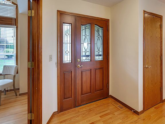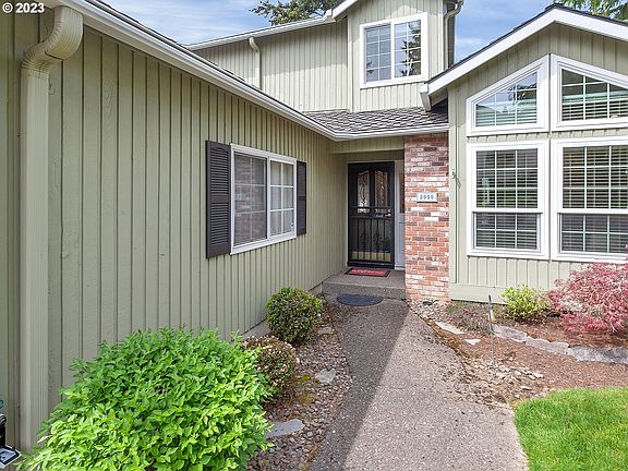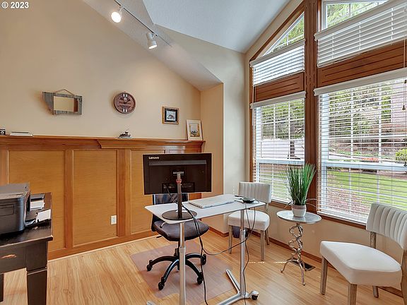 Welcome to this exquisite, two-story home in the highly sought-after Eastridge Park neighborhood of Southeast Portland. Boasting 2,221 square feet of elegantly updated living space, this home features 3 bedrooms, 2.5 bathrooms, and is perfectly situated on a corner lot, elevated above surrounding homes for unobstructed panoramic views of the downtown Portland skyline and bridges.Upon entry, you are greeted with a main floor office featuring vaulted ceilings, wainscoting, and tons of natural light, offering an ideal space for work or study. The formal living and dining rooms are perfect for entertaining, while the family room becomes a cozy retreat with its gas fireplace and custom built-in cabinets.The home's kitchen is a chef's dream, complete with hardwood floors, granite countertops, a center island cooktop, and high-end stainless-steel appliances. Adjacent to the kitchen, the eating area is surrounded by floor-to-ceiling windows, immersing you in the breathtaking city views while you dine.The primary bedroom is a private sanctuary featuring a remodeled en-suite bathroom equipped with a large tiled shower, skylight, and granite countertops. The additional upstairs bedroom cleverly includes a Murphy bed, perfect for guests or versatile living.Eastridge Park neighborhood is known for its peaceful greenspaces and park, lending a tranquil ambiance to this beautiful home. The property is perched above the other homes in the neighborhood, further enhancing the panoramic views and creating a sense of privacy.This home encapsulates the perfect balance of comfort, style, and convenience. Make it your sanctuary in this charming area of Southeast Portland.