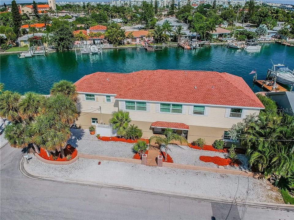 Perfectly placed on a quiet cove of the intracoastal waterway providing direct access to the Gulf on deep water. Located on an oversized lot at the end of a cul-de-sac, a roundabout leads comfortably into a spacious 2 car garage. Inside, an elevator takes you directly to the top level owner's suite overlooking the waterway which boasts an exquisite en suite bathroom (2017) with dual sinks and walk-in closet. The main living area with alcove perfect for gym equipment/work station is an open floor plan providing ample space. Natural light allows you to enjoy the water view and functional kitchen with granite countertops, raised panel cabinets and Stainless Steel appliances (2018) provides a perfect place for entertaining. Two additional bedrooms have pleasing water views and all share a bathroom with separate soaking tub and shower. In addition, the first level has an entirely separate suite not included in the heated sq ft (approximately 2,000 sq. ft.) A seating area, bar, and additional living room has a spectacular water view and allows for privacy from the bedroom and separate full bath. With plenty of storage throughout, this house is perfect for the avid boater and beach lifestyle. The remarkable marine life off your dock, walk to all the restaurants and festivals on Corey Avenue, or to the sandy beaches make this a premier location! Not to mention the new roof (2016) tankless water heater (2017) and separate electrical panels make it a great value. You can even add your own pool in the backyard!