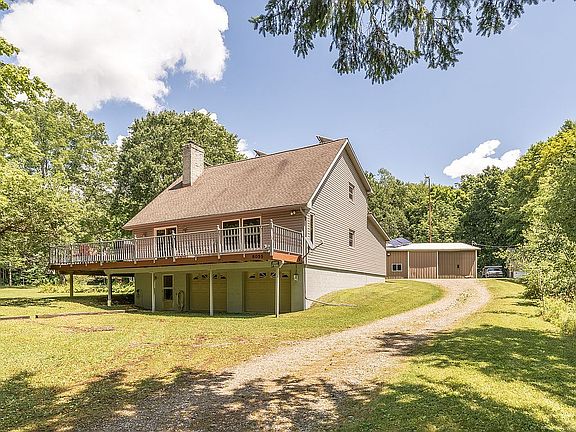 NO UTILITY BILLS! That's right, no heat, electric, water or sewer with this home. Nestled in the hills of Springwater is this outdoorsmans dream home. 7.5kw of solar installed on this beautiful home provides all the electric needs. Also included is the Skystream wind generator in the back yard. The kitchen boasts 40 feet of granite counters and porcelain floors. Tons of hardwood cabinets and first floor laundry. Huge living room with knotty pine cathedral ceilings. Warm up with one of two wood burning stoves or lp stove in primary bedroom. Extra large first floor primary bedroom with half bath. Wrap around deck gives you an outdoor space to enjoy all this property has to offer. Your own personal spring fed pond! 36x72 Morton pole barn with heat and automobile lift. This shop includes 200 amp service, concrete floors and oversized doors. 48 foot machine shed serves as overflow to the main shop. Two car garage located in the basement. Walk out your door to hunting, hiking, snowmobile and Atv trails. Minutes from the lakes for fishing and kayaking Much much more, call or text for your private showing.