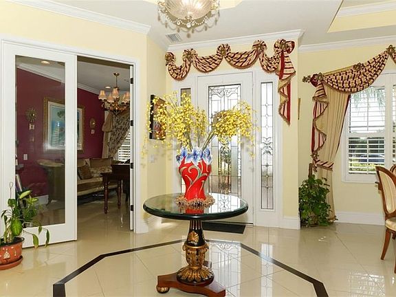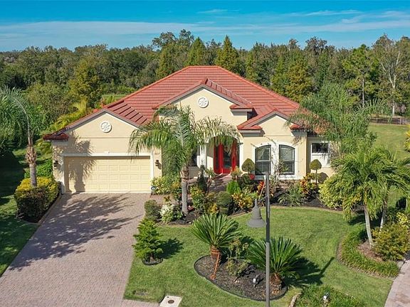 Located in the exclusive gated community of Riva Trace in University Park. This lake & preserve front 4bd, +den 3ba, 2 car garage, pool home features 12ft ceilings, 8ft doors, polished porcelain tile in the living areas/kitchen, carpet in the bedrooms and plantation shutters throughout. The gourmet kitchen has 42" soft close wood cabinets that bump and stagger w/crown moldings and under cabinet lighting, tumbled marble backsplash, SS appliances, 5 burner gas cook top, wall oven, granite countertops, built-in desk, large pantry , breakfast bar, and a butler kitchens/bar. The den/office has glass French doors for added privacy and adjoins the Master Suite. The Formal Dining, Living, Family rooms and Master Bedroom feature crown molding, coffered ceilings and sliding glass doors that lead to the pool. The Master bedroom en suite has a walk in closet with custom built ins. Master bathroom features a walk-in shower, spa tub, dual sinks, wood cabinets and granite countertops. For added privacy 2nd & 3rd bedroom can be closed off with a pocket door and share the 2nd bathroom with tub. 4th bedroom is adjacent to the 3rd bathroom/cabana bath with shower and leads to the pool. The laundry room feature upper and lower cabinets, utility sink. Entertain Family and Friends in the resort style outdoors with screened in pool area, covered lanais, travertine pavers, a summer kitchen w/gas grill, side burner and sink, salt generated gas heated pool with waterfall. The 2 car garage has overhead storage. No CDD fees. Low HOA fees. Minutes from UTC Mall, Benderson Park, Whole Foods, tons of shopping/dining, I75, Downtown SRQ/Bradenton/St Armands Circle & their world class beaches! Some chandeliers and window treatments are excluded See List-but everything in home could be available on separate bill of sale.