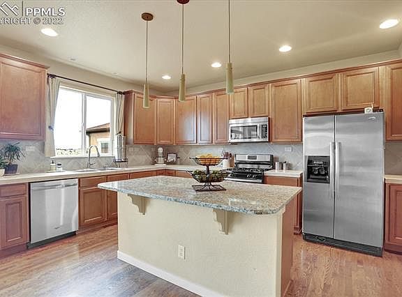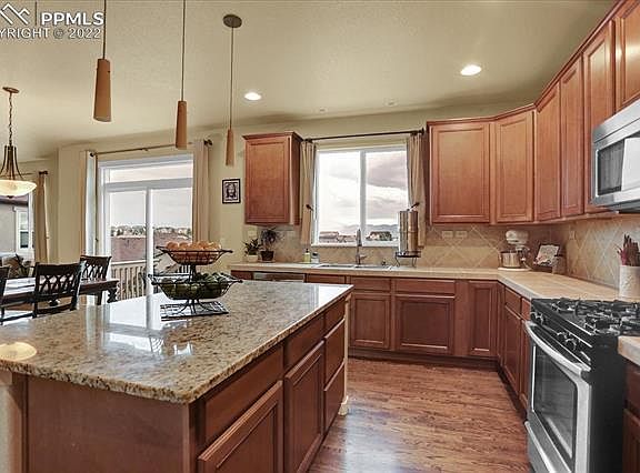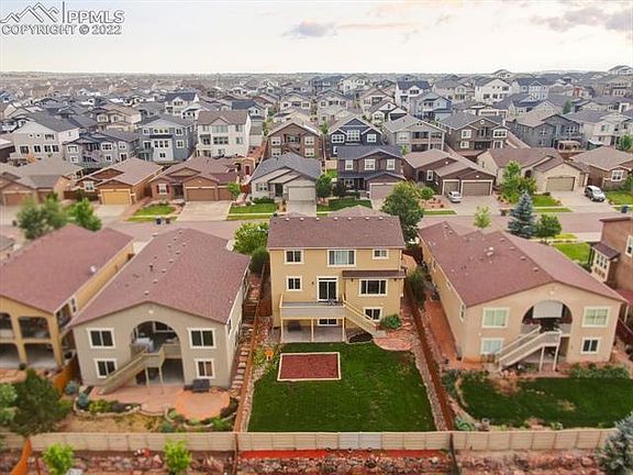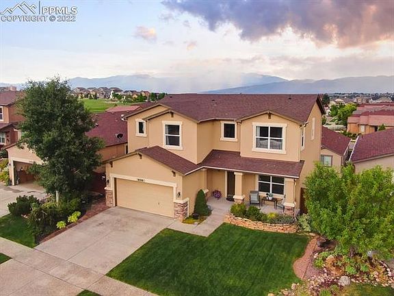 Views, views, views...This meticulously maintained and updated 2 story home on a prime lot welcomes you with a covered front porch and features 4 bedrooms, 3.5 bathrooms, 2-car garage, in a prime 20 Academy school district location with quick and easy access to parks, restaurants, grocery stores and the Powers corridor. Enjoy front range views of the daily sunset from every westward facing window in this beloved home, including the walkout basement The main level offers an open floor plan with oak hardwood flooring, a gourmet kitchen, entry waiting room which can be used as formal dining room or home office, living room with a gas fireplace, and a bathroom. The kitchen showcases extra tall cabinetry, pantry, decorative tile countertops and backsplash, a huge granite island for entertaining, dining area with walk out to new giant 10 x 20 ft. deck offers panoramic views of the front range. All stainless-steel kitchen appliances! Upper level offers master suite with 5-pc bath (separate shower, soaking tub, double sinks, and toilet) and huge walk-in closet, 3 additional bedrooms and two full baths. Bedroom 1 also has adjoining bathroom and walk-in closet. Laundry room is conveniently located in upper level. Basement walkout to a concrete patio offers a beautiful space to relax or entertain while enjoying a beautifully landscaped low maintenance backyard. Front and backyard with auto-sprinkler system and drip line, French drains on downspouts, and large playground area perfect for a childrens playground set or garden. Central Air. Security system. Built in garage shelves. Come and see this gem today!