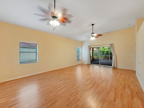 Nice 3/2 one-story home in the gated community of Woodbine. The home has an open living concept with volume ceilings and a kitchen that opens to the dining and living room. The bedrooms are split with 2 guest bedrooms and bath at the front of the house, and a large master suite with en suite bath at the rear of the house. Plus a bonus room upfront could be an additional bedroom or a in-home office. The outside is pretty special. Sliders off the living room open to a spacious screened patio that looks onto a large green space, giving you the feeling of having your own private park right outside your doors. The home has a dedicated laundry room, plus a 2-car garage. LOW monthly HOA fee of $225 includes maintenance of all common areas, 24/7 security, basic cable, landscaping, irrigation maintenance. Woodbine is a gated with 24 hours security guard. Clubhouse and 3 community pools, basketball courts, tennis courts, exercise room, playground. Centrally located to shopping, entertainment, I-95, Turnpike and PB International Airport.