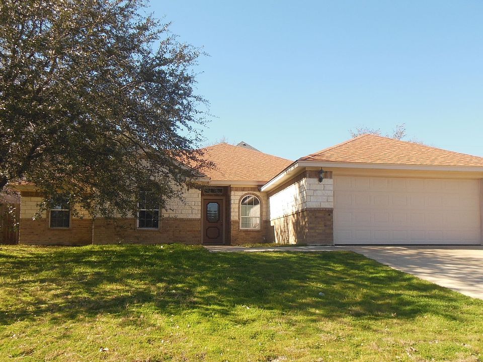 Beautiful modern home located in the hills of Harker Heights featuring, 4 bedrooms, 2 bathrooms, two-car garage (w/remote & outside keypad), granite countertops, stainless steel appliances to include: refrigerator, dishwasher, stove, and built-in microwave, dark-colored cabinets, breakfast bar, 2 dining areas, 2 living areas or 2nd living area can be used as office, laminate flooring throughout, ceramic tile in bathrooms/kitchen, stained/Texas star stamped concrete in the foyer, 2" wooden blinds in all rooms (except master), crown molding in main living areas, two-tone paint throughout, separate shower, jetted tub, two walk-in closets in master, laundry room and wood privacy fence. During those hot Texas summer months, you'll love the shade tree in front! Interested in this home? Submit your application here!