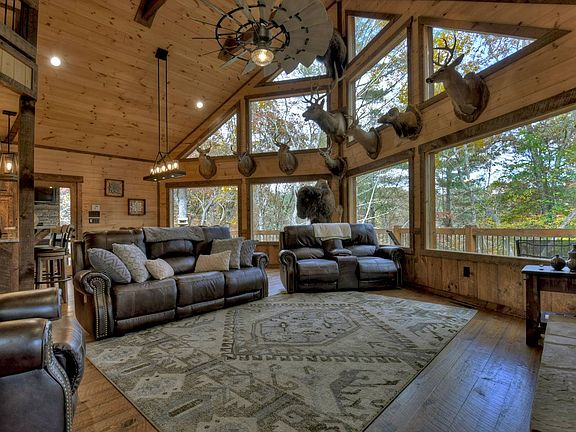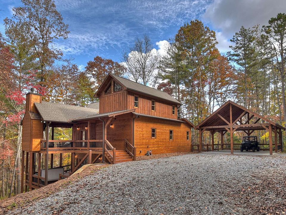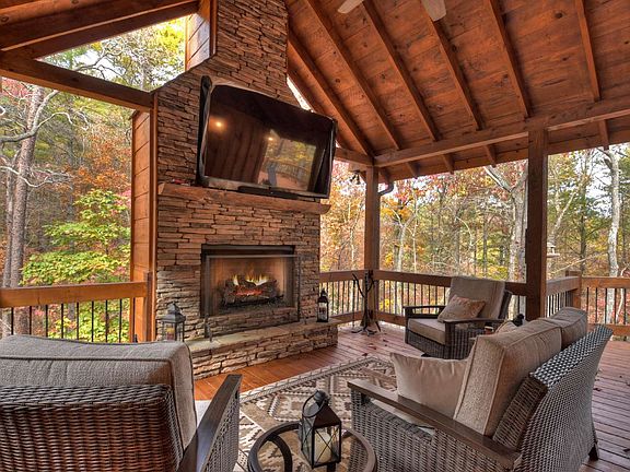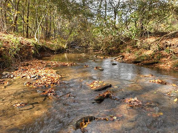 Step Into Total Privacy in this Luxury Rustic Retreat! 3br/3ba w/carport tucked away on 7.57 acres w/437 ft. on a rushing noisy creek complete w/impressive barn/workshop finished like a cabin. Main level offers open concept great room w/soaring/cathedral ceilings/ walls of windows/stone wood burning fireplace, kitchen w/granite CTs/upgraded appliances/custom cabinetry, large master suite w/walk in closet/spacious bath w/double vanities/custom tile shower. Upper level offer 2nd master suite. Terrace level offers game room w/wet bar/stone gas log FP, guest BR/BA. Plus partially unfin. bsmt. area for storage/future expansion. Elegantly rustic mix of all wood finishes/textures throughout plus high end furnishings included in sale. Amazing exterior space ~ main level party porch w/3rd stone fireplace/upper & lower decks/ terrace level porch complete w/hot tub. Creek front flagstone firepit area, & must see incredible workshop!