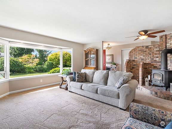 True one-level living is here in this very special 3 bed, 1.75 bath rambler, perfectly situated near Highway 20 and I-5. Premier feature is a 400 sq ft "deckroom" made for the PNW! Gorgeous covered deck appointed with wood and stone entertains year round w/ a wood stove. Mature landscaping and fully fenced backyard provide privacy. Ideal layout w/ formal living room. Your true statement piece is a wood stove w/ storybook wood surround. Beautiful real oak floors! Corian counters in both bathrooms while primary has a whole Corian shower and a slate floor. Kitchen has eat-in bar and shines w/ floor-to-ceiling cabinets and granite counters. All matching appliances incl washer/dryer. Outbuildings for ext storage. Prop NOT in a flood plain!