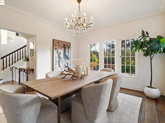 Elegant Crocker Highlands Tudor blending architectural pedigree with modern refinement. Original details include arched doorways, rich woodwork, and abundant leaded French glass windows framing grand formal spaces. Chef’s eat-in kitchen with marble countertops, subway tile backsplash, custom cabinetry, and stainless steel professional appliances guaranteed to delight the chef of the household. Large, light-filled dining room perfect for the upcoming holiday season, and stately living room with French windows and wood-burning fireplace ideal for entertaining. Sultry, adjacent library with enchanting stone fireplace, inviting both conversation or quiet reprieve. Private rear gardens, patio, and turf ideal for entertaining or play. Additional features include two-car off-street parking with a secured carport and outlet for EV charger, large attic with potential expansion possibilities, basement area with double laundry system, and a flex space ideal as home gym. Minutes from award-winning elementary school, Grand-Lake shops and restaurants, Lake Merritt, and Bay Bridge to SF.