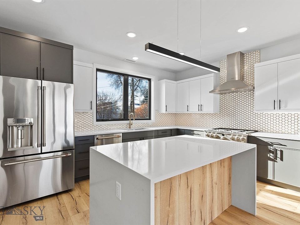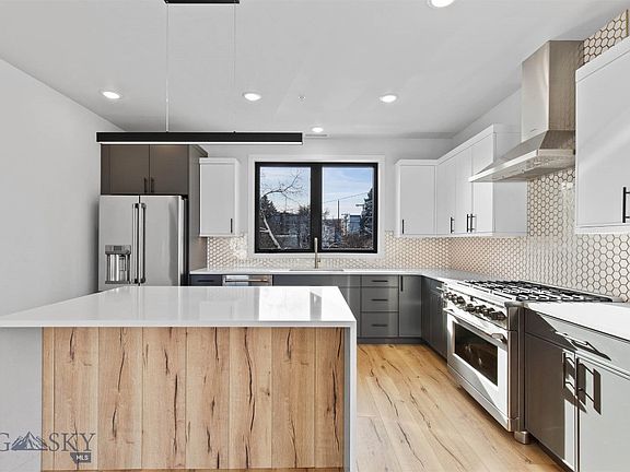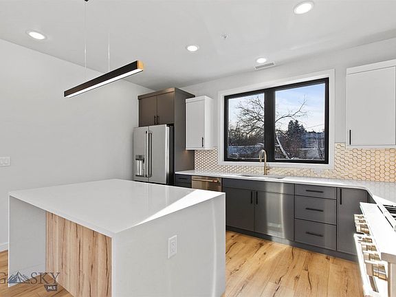 This amazing end unit, light filled condo is located in the heart of historic downtown Bozeman and just steps from Montana State University! All new construction with 1,650 sq ft; 2 beds plus an extra room and 2.5 baths; including a fully finished and heated 2 car garage! The first floor offers a fantastic flex space that can be used as an office, exercise room, mud room, space to store your bikes, skis, you name it; use it for whatever you desire. The extra room also includes artwork from local artist Averi Iris; you'll enjoy your own special Montana art! The main floor is a huge open space with 9' ceilings which brings in even more natural light. The main floor is the perfect gathering space for family, friends and entertaining. There is a lovely gas fireplace with a custom herringbone tile design, cozy for cold Winter nights. This corner unit offers more light coming in through the beautiful Anderson contemporary windows and tree views are framed perfectly! In the chef's kitchen; you'll enjoy stylish kitchen cabinetry, and handpicked tile backsplash to compliment the white Quartz countertops and waterfall edge on the large island. The professional style GE Cafe appliances include a wine refrigerator and a commercial style 36" range & hood for all your culinary masterpieces. The top floor includes a master suite with a custom tiled shower and undermount vanity motion detection lighting as well as radiant floor heat. The vaulted ceilings and shiplap walls give the master suite a warm, cozy and comfortable feel. The junior suite has its own wonderful bathroom with the same undermount vanity lighting and beautiful custom tile. The home includes Anderson windows and doors which give a stylish look while offering plenty of energy efficiency. Move in and enjoy the downtown experience of restaurants, bars, breweries, the library, markets, shops, walking trails etc. The beauty and simplicity of this home offers all of the fun of downtown living without the urgency to take care of a yard, garden or other exterior work; it's the beauty of condo living. This is a must see!