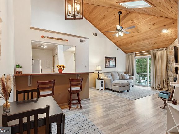Welcome to this stunning, meticulously maintained end-unit condo in the highly sought-after Telford Hills private community! Move-in ready, this home boasts an inviting and spacious open floor plan filled with charm and character. The main living area features a dramatic A-frame, wood-stained ceiling with skylights, creating a bright and airy atmosphere. A floor-to-ceiling stone, wood-burning fireplace adds warmth and a striking focal point to the living room. Adjacent to the living area is a galley-style kitchen, perfect for preparing meals and entertaining. Step out onto the private balcony, which has just been repainted, and enjoy peaceful views of the surrounding wooded area—a serene retreat for relaxation. This home offers two generously sized bedrooms, a full bathroom, along with the convenience of an in-unit washer and dryer. Notable updates include a newer HVAC system installed in 2022 and a newer hot water heater (2019). Situated in the award-winning Souderton Area School District and conveniently close to dining, shopping, and entertainment, this home offers an ideal location for both comfort and convenience. Showings begin Tuesday, October 1st, with a Twilight Open House scheduled for Friday, October 4th, from 5:30-7:30 p.m. Don’t miss your chance—schedule your showing today! This beautiful home is ready for its next owner!