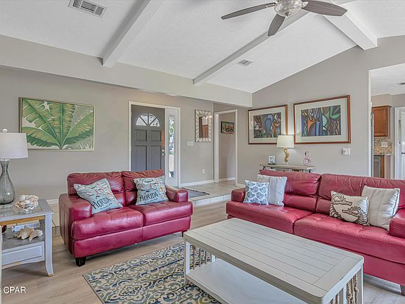 Quiet cul-de-sac location with NO HOA! and SHORT-TERM RENTALS ALLOWED! Over one-third acre, plenty of room for boat parking with privacy-fenced backyard and covered patio! This 3BR/2BA offers 5 year-old roof, updated kitchen and baths plus 400 sq. ft. bonus room...perfect for craft room, man cave or indoor she shed! Kitchen offers granite countertops, stainless appliances. New vinyl plank flooring in living area plus wood-burning fireplace for cozy winter nights! 5 minutes to Grand Lagoon and the beach! Owner has termite bond too!