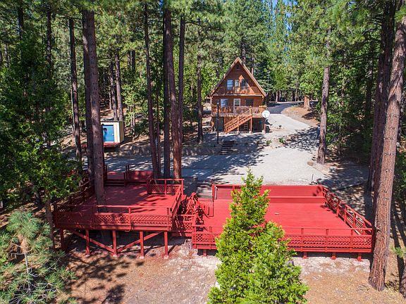Gorgeous cabin in the woods up at Lake Davis! On just over two acres, this cabin offers 1165 s.f. with all the essentials and comforts of home, away from the hustle and bustle of city life. With one bedroom & one bathroom downstairs and two more bedrooms and bath upstairs, you can have guests stay, too. Or, your guests can bring their travel trailer and park it on one of the two RV pads with full hookups and expansive lower deck. This is a great property for retreats or a family get together. The 430 s.f. basement is great for storing toys and the 2-car garage offers covered parking and even a boat pull-through. Only minutes from Lake Davis and spectacular golf in Graeagle, and a quick 45 minutes to Reno/Truckee. (Great cell service) Under Home Warranty. Come see it today! Improved this year: * New flooring for the entire home. Porcelain tile throughout the lower level and bathrooms, new carpet in the bedrooms and new door hardware. * Kitchen makeover with new appliances, sink/hardware and beautiful Silestone countertops. * Both bathrooms redone with all new fixtures and appointments, including Kohler water saving toilets. * All new ceiling fans and LED motion lights surrounding the property. * All new asphalt driveway and cement porch. * New gravel roundabout. * New water heater, water softener and whole house water filter. * Lower deck refurbished and repainted. * Alarm system. * Tree trimming around entire property for defensible space and unobstructed views