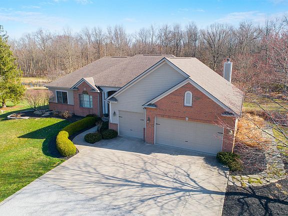 Impossible to find ranch home with lower level walk-out in New Albany situated on charming road on 10 acres with pond and trees. Well- built custom home w all new interior paint and recently updated stunning master bath. Open floor plan w eat-in kitchen w white cabinets featuring hearth room w fireplace. Lower level walk-out features kitchen, family room, game/media space, office area, and 4th bedroom w 3rd full bath. Interior photos will be posted online 4/1/21. Geothermal HVAC. Property is zoned for horses and chickens, etc. Run-in shed style outbuilding on property.