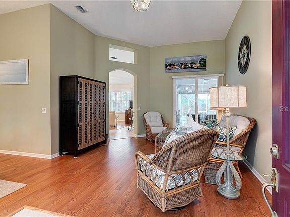 A WONDERFUL FIND IN THE COUNTRY CLUB OF MT. DORA WITH VIEWS OUT OF THE BACK OF THE HOME OF A POND AND THEN THE GOLF COURSE. A 4/2 with hard wood floors, the kitchen has had a complete make over with tall Oak cabinets, granite, and up dated appliances. The owners have installed all new windows and sliding doors. there are pavers leading up to the leaded glass front doors. The views from the lania are breathtaking, The majestic oak trees frame the pond, with it's wildlife and beyond that you see the 17th tee box. this home is just spectacular. on the lania, you can choose to sit under the covered portion or lounge within the screen enclosure out in the uncovered portion. In the hall outside of the guest bedrooms, there built-ins for desk and computers The garage floor has multiple coats of epoxy coating for a very clean garage. A HOME WARRANTY IS INCLUDED. SEE THE VIDEO ON U TUBE!