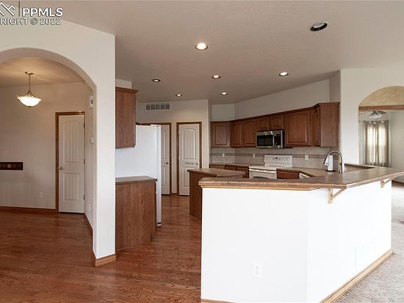 Wow, come take a look at this beautiful one-owner home with the whole front range mountain views! This home is conveniently located on a large lot featuring Greenbelt open space to the rear, and a vacant lot located next to it to the north. The vacant lot is owned by the water municipality and should remain vacant for the foreseeable future. The home offers an open floor plan with 9-foot ceilings, beautiful oak floors, arched doorways and tons of natural light. The kitchen is open to the living room and dining area and has loads of cabinets, counter space, and a pantry. The living room has a nice corner gas fireplace for comfort, on chilly winter days. Off the living room is a sliding patio door that leads you to the back deck with a fenced, private, irrigated, landscaped, and lighted backyard with the most spectacular front range views! The main floor offers a master bedroom and a 5-piece master bathroom with a walk-in closet and an additional two bedrooms or an office if desired. The basement is perfect for entertaining with a large family room, two additional bedrooms, a good-sized storage room, and a full bath. The front yard is landscaped with a beautiful mature Catalpa tree and additional plantings. The front shows well in the evening with the backlighting lights. The home has a full 2-stall garage with a third stall for storage, toys, or smaller cars. Easy access to shopping, restaurants, I-25 and Fort Carson. Come and take a look at all this home has to offer!