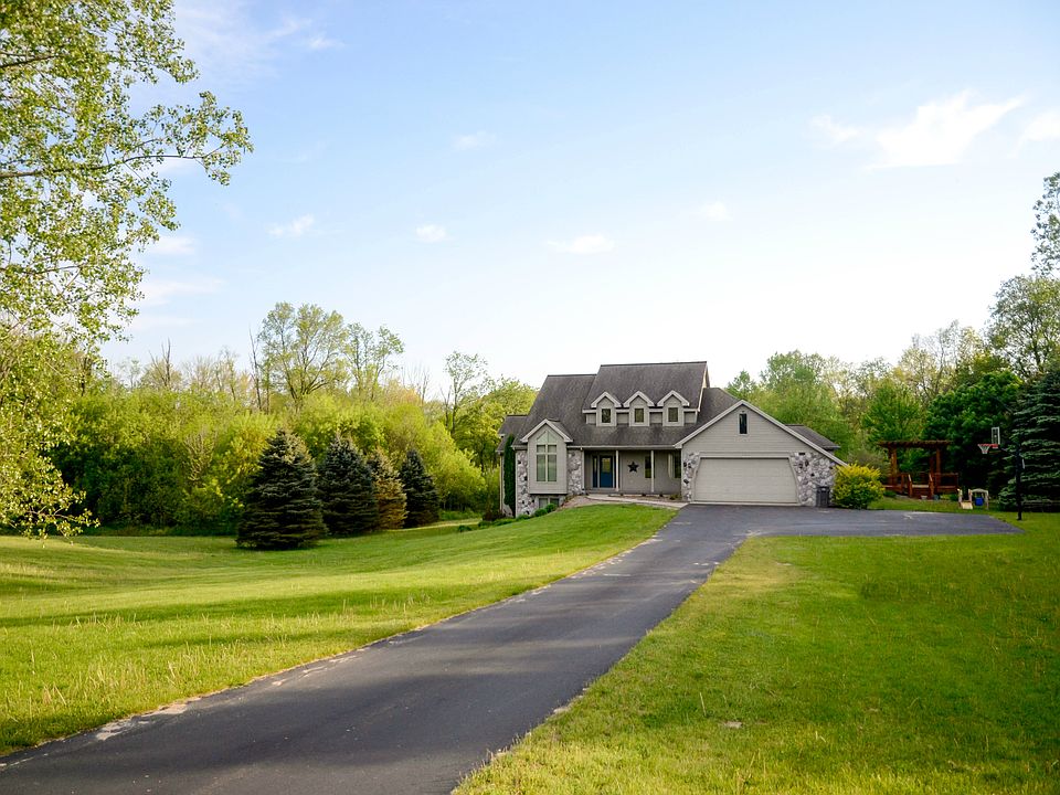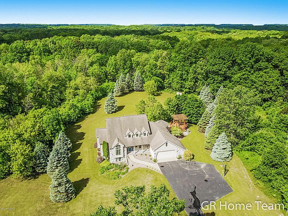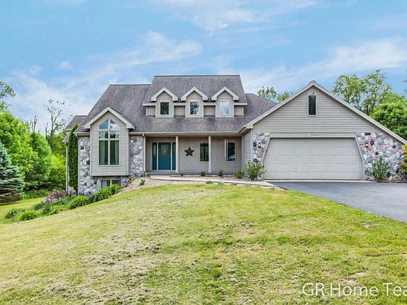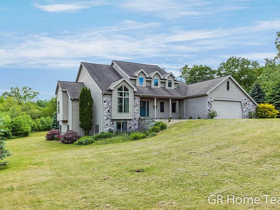 Three level, 4,500 sq. ft., custom built home on a 2.39 acre lot in desirable Caledonia School District. Located at the end of a quiet cul-de-sac. Attached 2 car garage. 5 bedrooms, 3.5 baths, and a two story great room with excellent view of the backyard that is surrounded by woods. Main floor den that can also be used as a 6th bedroom. Finished daylight basement with 2 of the bedrooms, 1 of the full baths, 3/4 kitchen, a living room that is wired for surround sound, and a cedar storage room. The back yard is perfect for entertaining with a three seasons room leading out to the patio and a large pergola. Stone steps lead down to the fire pit. Other features include a high efficiency heat pump to help reduce heating costs, Bryant furnace, zone based climate control, central vacuum system, 2 gas fireplaces, KraftMaid cabinetry throughout, lots of extra storage space, in ground sprinkler system, apple trees, and peach trees. $425,000 Contact Jason at 616-536-0146