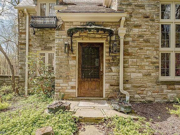 Situated on a serene 6.9 acres surrounded by untouched nature, this spectacular English cottage has been completely reimagined and is ready for a new owner. While the home was built in 1929, it has been renovated from top to bottom with stylish finishes that perfectly complement its historical character. The home is set back from the street with a creek running along the property, plus multiple outdoor areas to appreciate the idyllic setting, including a deck, a gazebo, a screened-in cabin. The original front door opens to reveal a diamond checkerboard tile floor and a hand-blown milk glass light fixture in the foyer. The spectacular two story great room features an original travertine fireplace, beautiful leaded glass windows, and charming molding that accents the doorway to the adjacent sunroom and dining room. With Calacatta Vagli marble counters, handmade Zellige tile backsplash, and stylish appliances, the kitchen is absolutely spectacular. The first floor primary suite includes