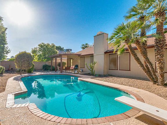 Incredible single level home in the extremely sought after community of central Scottsdale! This beauty boasts pride of ownership! Just steps up to from the walkway, you are greeted by the lovely cozy entryway giving way for tons of natural light through the beautiful skylights! Just past the door, you are welcomed into the formal living and formal dining area featuring vaulted ceilings, gorgeous wood vinyl flooring, and a perfect fireplace for those wonderful chilly winter nights. Just off the living room, is the impressive updated open kitchen with newer stainless steel appliances, beautifully upgraded cabinetry, and gorgeous granite counters with breakfast bar, plenty of space for meal prep and entertaining! Kitchen opens to the eat in kitchen and second living or family room! Plantation shutters throughout keep the home extremely cool! Master bedroom is conveniently located in the back east corner of the home for optimal privacy! Wonderful size master bedroom features full length master closet, private master bath with dual sinks, upgraded and remodeled tile shower, and added cabinetry. Down the hall from the master bedroom are two additional great sized secondary bedrooms with walk in closets. Full bathroom across from the secondary bedrooms and perfect for family or guests! Backyard is a buyers oasis! Take a step on the lovely patio with misting system and look out to the gorgeous sparking diving pool! Huge side yard gives plenty of space for anything you can dream! Garage features 2 car parking spots, and laundry hook ups. Don't miss out on this impeccable home!!