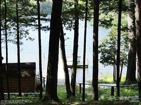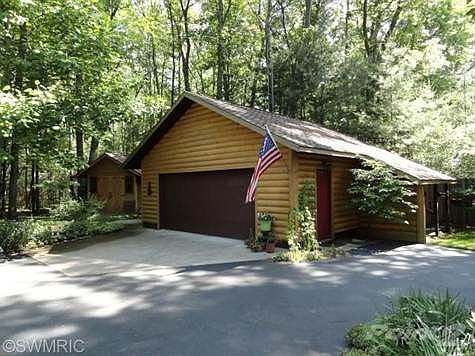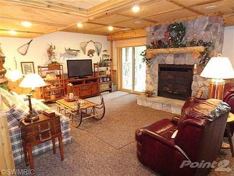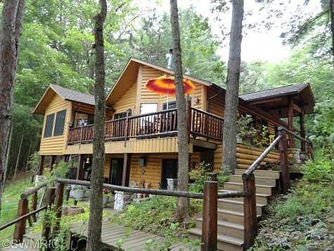 Over 2,000 ft. of finished living space in this year-around log-sided home or cottage! Cedar and pine wood paneled walls throughout; many cedar built-ins. Upstairs entrance room with built-in lockers, a great room with wood burning fireplace, a 4-season sun porch, 2 bedrooms, and a bathroom with granite, tile, and glass doors. The maple kitchen cabinets also have lights and glass doors. Additional sink in island bar, stainless steel appliances, and tile. Sliders to deck. Lower level family room with gas log stone fireplace, bar area with sink, log-sided bedroom, laundry/storage room. Sliders to patio. There is a 24'x24' garage with attached room and firewood storage area. Another storage building next to garage, and fisherman's/swimmer's building by lake. Winding, paved driveway leads to landscaped yard with underground sprinkling. Great swimming and fishing here! No-wake, 40 acre lake leads to 3 others by channel. Contact Nancy Randall at Big River Properties 231-620- Brokered And Advertised By: Big River Properties Listing Agent: Nancy Randall