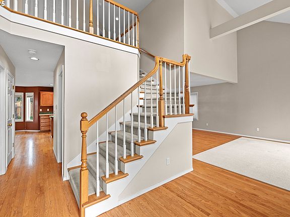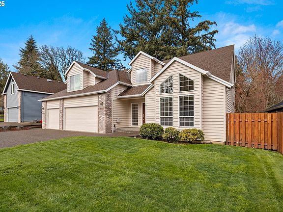 Welcome to Raze Meadows, a charming neighborhood of homes offering spacious lots & beautifully landscaped yards. This delightful home features both formal & informal spaces, providing ample room for relaxation and entertaining. You’ll feel at home from the moment you step inside. The unique curved staircase is a stunning architectural feature, and the living room, with its soaring ceilings, striking beam, & expansive front window, bathes the space in natural light and warmth. The adjacent formal dining area is perfect for hosting holiday dinners. Hardwood floors throughout the entry, living, and dining areas complete the elegant feel of these spaces. At the back of the home, the seamless flow between the family room, kitchen, & dining area strikes the perfect balance between open-concept living & functional design—enhanced by stunning views of the beautiful backyard. The family rm features a cozy fireplace, while the adjoining nook is perfect for casual, everyday meals. The kitchen, with an island, hardwoods, stainless appliances & walk-in pantry, is well laid out and waiting for your personal touches. The elegant staircase leads to the second floor, where you'll find the spacious primary suite with a double-door entry, a spacious bath with a dual vanity, soaker tub, skylight and walk-in closet. Two additional bedrooms with a full bath situated in between. A large bonus room, with generous storage offers a versatile space for kids, entertainment area, office or workout room. Step outside to the expansive, fenced backyard, complete with a spacious deck and patio perfect for dining or simply relaxing. The attached three-bay garage offers plenty of storage, and recent upgrades include a new furnace and A/C (2019), roof 2015), water heater (2019), and waterproofing (2019), along w/various other home improvements over the years This home is conveniently located near Trader Joe's, Planet Fitness, Cook Park, & Tigard HS, with easy access to I-5/217 and Bridgeport Village.