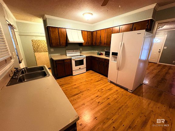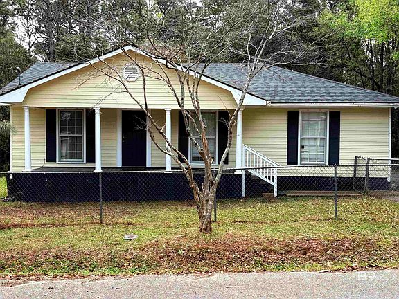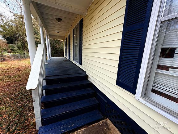 Looking for a 3 bedroom 1.5 bath home, with spacious front and back porches? Then here's your chance! This 1176 square foot home has plenty to offer. You will step into the living room and be greeted by a view, of both living room and dining area. The layout is functional, with a modest kitchen, which includes all the appliances needed for a growing family. The washer, dryer, and refrigerator will remain at the home. The carport allows entrance, without enduring the south Alabama spring showers. The primary room includes a 1/2 bath ensuite. The hallway full bath, has been recently updated. Each individual room has a ceiling fan with a light feature. Now let's talk about the porches! The front porch is waiting for your rocking chairs, and spring flower hanging baskets. The back porch, is ready for family gatherings and friend socializing! There's a perfect spot for a grill, outside the covered area. Two built in benches for extra seating, await your summer gatherings. The yard is fenced. A metal shed, accommodates the property. Buyer to verify all information during due diligence.