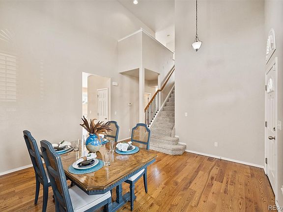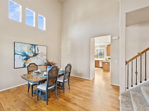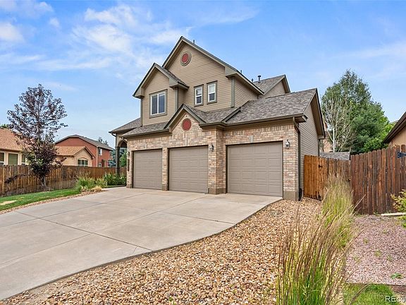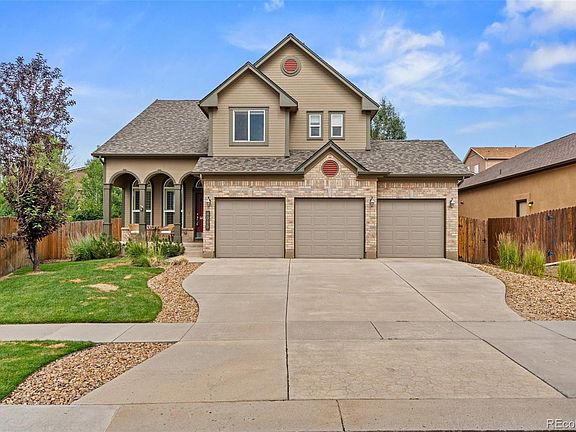 BOM DUE TO NO FAULT OF SELLER!!!! VA ASSUMABLE OPTION AVAILABLE! Discover the spectacular Cumbre Vista home in D20, featuring an open floor plan with dramatic soaring ceilings and wood floors throughout most of the main level. The grand entryway welcomes you into the living room, adorned with arched doorways. The large kitchen is equipped with stainless steel appliances, a corner pantry, tall cabinets with crown molding, and stone countertops. Adjacent is a walk-out dining room that opens into a two-story great room, boasting a gas-log fireplace with a stacked stone surround, built-in bookcase, and lighted ceiling fan. The main level also includes a laundry room and a powder bath conveniently located off the three-car garage, which features an epoxy floor, storage, a service door, and new insulated doors. Upstairs, the master bedroom offers a lighted ceiling fan and barn doors leading to a luxurious master bath with a dual sink vanity, garden tub/shower, and walk-in closet. Two additional bedrooms, one with a walk-in closet, share a Jack and Jill bath with a dual sink vanity and a tiled tub/shower. A built-in hall desk provides a perfect workspace. The finished basement hosts a large family room, an additional bedroom with a walk-in closet, and a full bath with a tiled tub/shower. Enjoy outdoor living with a patio and power awning, a fenced yard with Peak views, and a storage shed for tools. The covered front porch adds to the home's charm. This exceptional home is close to schools and shopping, offering the perfect blend of luxury and convenience in the Cumbre Vista neighborhood. Don't miss the opportunity to make it yours!