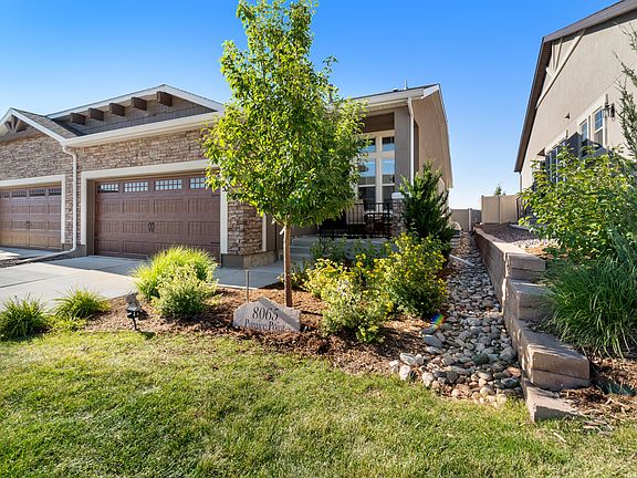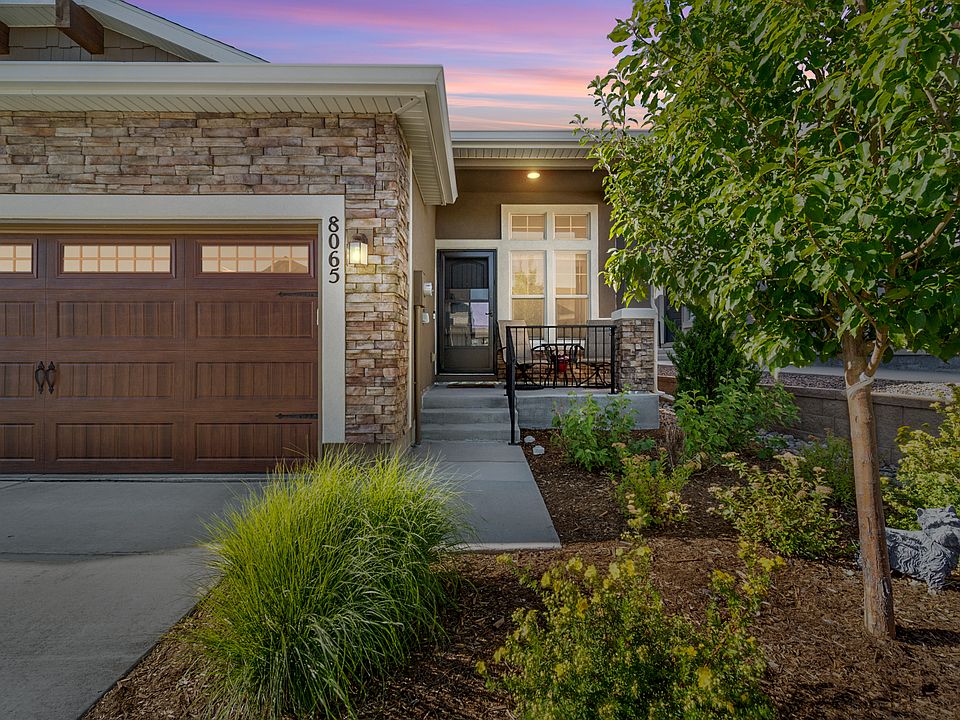 Welcome to this beautiful townhome located in the sought-after Enclaves at Mountain Vista Ranch! Built in 2019, the property boasts an open floorplan with vaulted ceilings that allows for effortless main-level living. Step into the inviting living room, filled with natural light and complemented by luxury vinyl plank floors, richly-stained soft-close cabinetry, and a cozy fireplace, which includes a blower to heat up the room fast on a cold night. A main-level half-bath is perfectly situated for guests. The kitchen will please anyone who loves to cook, featuring a gas range and ample prep space that makes meal preparation a breeze. The main-level primary bedroom is a retreat, complete with an ensuite bath fitted with a double vanity, sizable shower, and spacious walk-in closet. Venture downstairs to the fully finished basement, where you'll find a second living area with a wet bar and two additional bedrooms accompanied by a full bathroom. Outside, you'll enjoy the privacy of a fenced-in backyard which is rare to find in a townhome. Parking is made easy with an attached two-car garage. Living in this community means enjoying low HOA fees, which include front yard landscape maintenance. Come experience comfortable, modern living in a fantastic location that's sure to fit your lifestyle!