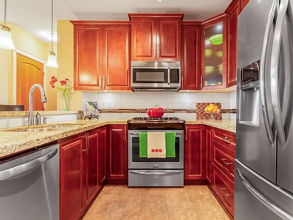 Elegant cherry wood kitchenBifold glass doorsPrimary bedroomLinen closetVersatile denAmple storage
