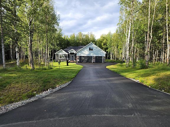 Beautiful Modern Ranch located off Palmer Fishhook and close to Recreation of Hatchers Pass!Featuring 1.32 acres, in a cul-de-sac, offering an open concept, this 4 bedroom, 3 full bath home offers larger rooms situated within 2,557 sq. ft. (see more/addendums)Walk into Luxury with the 9' ceilings, several can lights, gas fireplace with rock surround, custom kitchen with quartz breakfast bar, stainless farm sink, pendant lighting, stainless steel appliance package, including refrigerator, matching rock backsplash, double ovens, walk in pantry. Covered deck located off formal dining room, Master Suite is spacious with a coffered ceiling, walk in shower with double heads, custom glass door, oversized soaker tub with outside views, his and her sinks, porcelain ceramic tiles in shower/tub areas and flooring, large walk-in closet with several built in shelves. Bedroom #4, over garage offers full bath and walk in closet! Separate laundry room, with cabinets and sink, washer and dryer included. Oversee the continuation of custom features in all areas and the ambiance of this home does not leave much to be desired! 3 car garage, paved driveway with additional RV parking, front yard is landscaped, easy to show! Custom door, lighting, flooring, plumbing fixtures and trim packages. Matte black hardware.