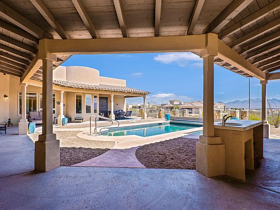 Stunning, luxurious & comfortable are just a few adjectives that come to mind as you enter this magnificent former showcase home. The entire property was built around the spacious outdoor living area and situated to capitalize on the breathtaking views of the Organ Mountains & City Lights from either inside the home or while outside enjoying the heated pool/hot tub or while entertaining friends and family around the outdoor kitchen. Through the front door you are immediately greeted with soaring 14 ft ceilings, and luxurious finishes throughout! The gourmet kitchen is open and spacious and ideal for the chef in the family. The master suite offers breathtaking mountain views and convenient access to the pool or hot tub through the custom french doors. The master bath features dual sinks, a jetted tub, huge walk-in shower and a spacious walk-in closet with it's very own laundry room! Additional features include- a detached casita, media room w/ wet-bar, gated community & refrigerated AC