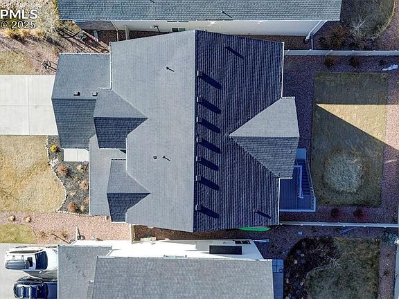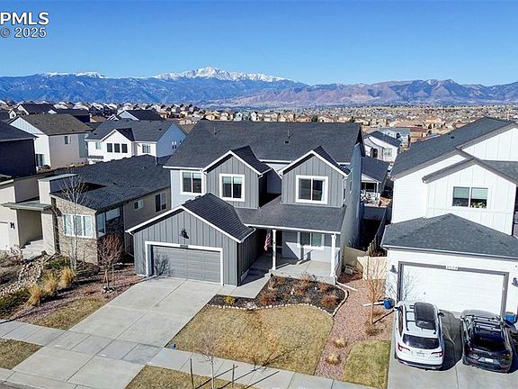 This home is a MUST see in the cozy, modern neighborhood of Cumbre Vista. Convenient to Powers, Falcon and Black Forest. You’ll instantly fall in love with the curb appeal and welcoming front porch. The main level open concept with LVP flooring greets as you enter into two story high ceilings (18ft.) with incredible views of Pikes Peak. The chef’s kitchen is sure to impress with ample storage, large central island with quartz countertops, updated lighting and views of the mountain range. The kitchen is open to the dining area and living room with vaulted ceilings and gas fireplace. The main level also includes a guest bedroom, full bathroom and a flex room which can be used as a home office, play room, reading/sitting room. Head upstairs and find 3 more bedrooms a full bath, laundry room, and a Master suite that is a true spa retreat! Off the master there is an additional room that can be used as an office, nursery, closet or sitting room. The spacious master bedroom has 2 walk-in closets and a 5-pc master bath suite with a soaker tub. The finished WALKOUT basement includes a rec room for those big game days, an additional bedroom, full bath, plus a bit of unfinished storage space. The outdoor living space offer a composite deck off the main level and a covered patio from the basement. The perfect place to hook up your hot tub! A fully fenced backyard allows for privacy and pets. This home could easily be a 6 BEDROOM HOME if closets were added to main level bedroom and room off the master suite. This gorgeous house has proximity to schools, shopping, dining, entertainment and 2 military bases. Since the home is only 6 years old, the furnace, water heater, roof and appliances are all newer! Just simply unload the truck and MOVE IN!!