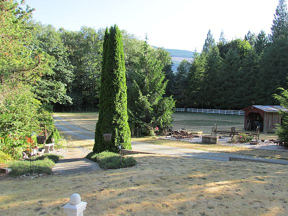 Birdsview! ... Extremely well maintained home. Spacious 2,250 sqft 3 bdrm, 2 bath on 1.74 acres. Master bedroom has private full bath and walk-in closet. Laminate hardwood flooring in family room and kitchen, wall to wall carpet in living room, vaulted ceiling, propane fireplace, large covered porch. Two car detached garage with two bay doors, carport attached at back of garage. Patio, gazebo, garden space, partially fenced pasture, tractor shed.