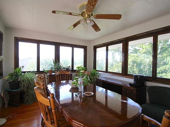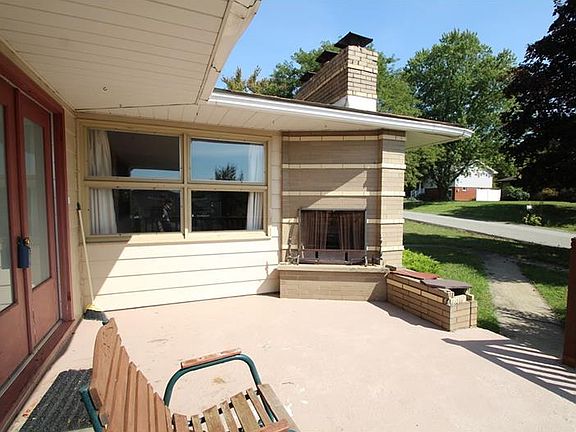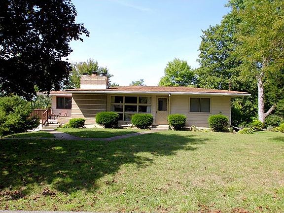 This mid century modern ranch has much of the retro character still existing such as an indoor / outdoor fireplace with striped brick accented chimney, large picture windows in both the living room and dining room, hardwood floors and more. A large deck along the whole rear of the house is a relaxing place to unwind in a private wooded setting with sunset views. House is set back on a park like lot on a quiet dead end street with no neighbors in the rear of the property. Close to Rivers Edge Golf Club.