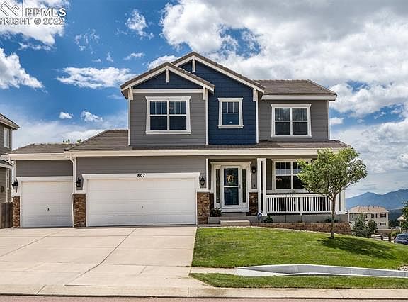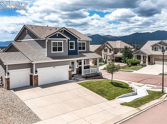 Welcome Home to this meticulously maintained home, recently painted exterior, 2-story corner lot haven in the highly desired District 20. Enjoy unbelievable views of Pikes Peak from the freshly updated covered Trex deck or walk-out patio or hang out in the fenced yard. Cook dinner in the large eat-in kitchen on the newer gas stove or the grill attached to a natural gas line on the deck. The kitchen also features stainless steel newer appliances, granite counters, cherry cabinets, and a corner pantry. It is adjacent to the well-appointed family room with a gas fireplace where you can hang out and watch your favorite shows. There is a separate dining room and living room/flex space as well on this spacious main floor. Upstairs there are 3 bedrooms plus the Primary Suite with its newly remodeled Primary bath with heated floors, a free-standing soaking tub, and spa-like shower that will make you the envy of all your friends. The Primary Closet is amazing with all of the custom builtins fit for a celebrity. The laundry room is also conveniently located upstairs as well as a second full bathroom with a double vanity. If this wasn't enough, there's also a finished basement with a second family room/flex area containing a 2nd heating fireplace, wet bar, a 5th large bedroom, a four bathroom, plus storage. The home has AC for those hot Colorado days and a whole house fan to quickly cool the home. All this plus a 3 car oversized garage with room for a workbench as well. Close to schools, shopping, restaurants, I-25, the Air Force Academy and so much more. Won't last long!