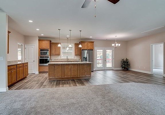 4.5 acres, sets off from highway, very private. Split floor plan, Carpet and vinyl removed in the open living area and replaced with Oak Hardwood floors which includes the LR, DR, Music Rm & Kitchen. Carpet in Bedrooms, vinyl in baths and laundry. Oversized walk in shower as well as oversized whirlpool tub in master. 9' ceilings throughout. Rocking chair front porch, covered back deck (8 x 20), open deck (8 x 12). Sprinkler system front, back, sides. goldfish pond in front.