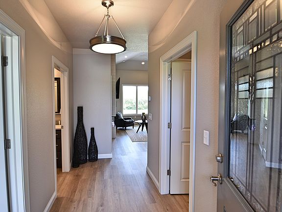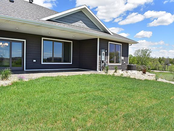 This beautiful townhome is situated on a lot that is one of a kind. It is elevated above the rural properties around it so it has views in every direction with a professionally landscaped sideyard featuring a boulder wall and walking path. The floor plan is just the right size with everything on one level. The entry is adjacent to spare bedroom and office which could be used as a third bedroom due to the nearby guest bath. The family room has a 14' high vaulted ceiling and unique tiled three sided electric fireplace. The open concept features a kitchen with alder cabinets, gas cooktop and oven with quartz countertops and a dining room which overlooks the large covered stamped concrete patio. The master bedroom is at the back of the home with recessed back-lit ceiling and the master bath features two sinks and a tiled shower. The large heated 2-stall garage has a storage area above and is next to the 1/2 bath, bench seat and laundry room. Don't worry about snow removal or yardwork, for the $150 monthly fee, the association will take care of that so that you can enjoy your time at our neighborhood park or walking trails. Relax at Heritage Park! Broker/Owner.